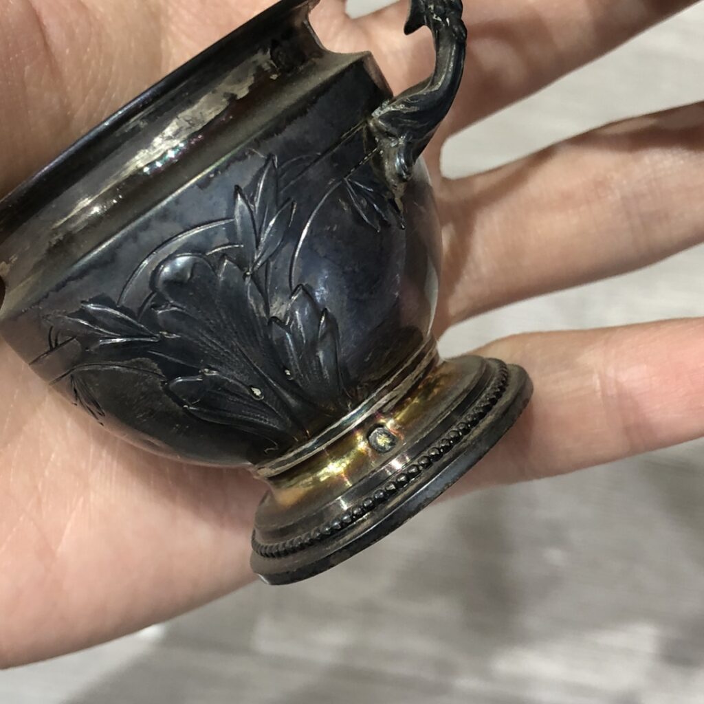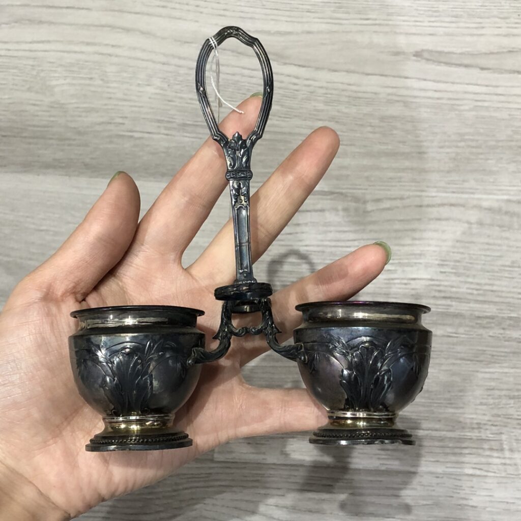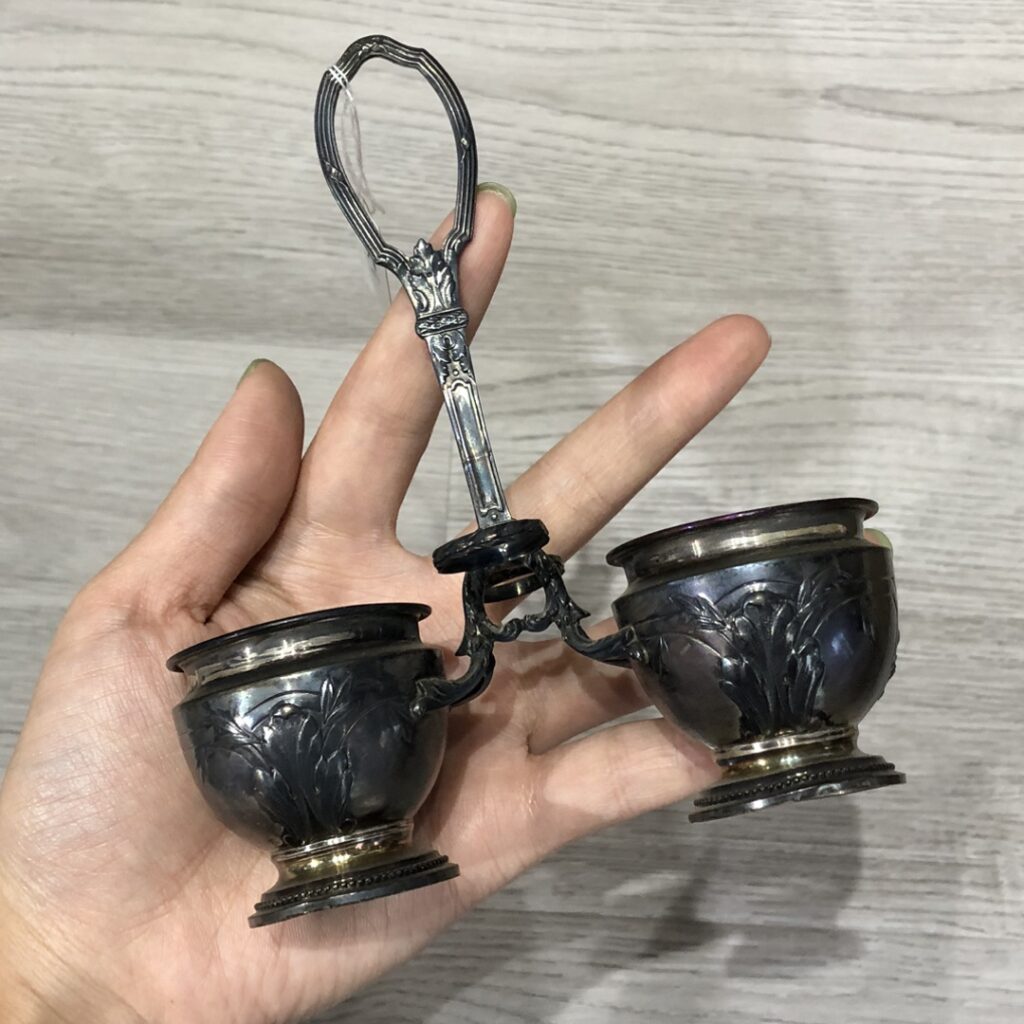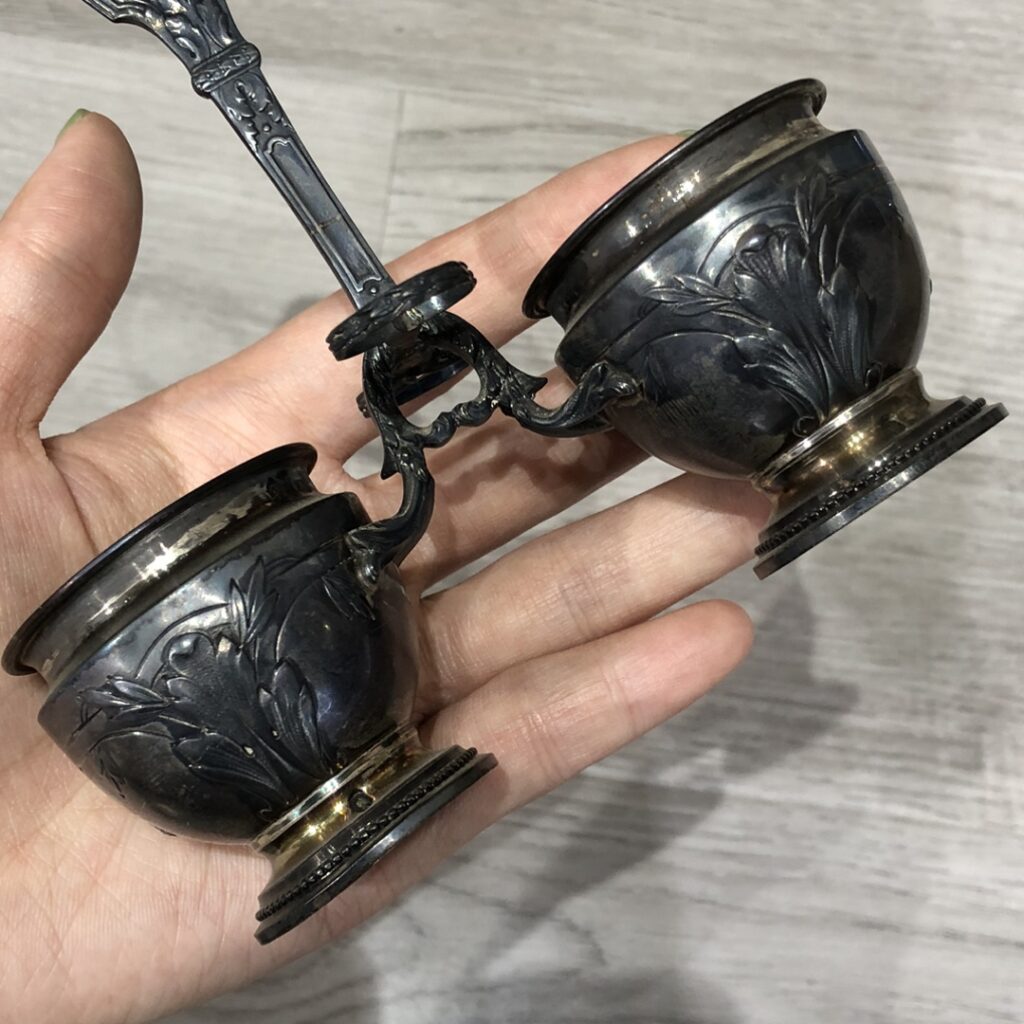 Juego de copas de plata antigua con diseño en relieve y acabado dorado en el interior. Peso de 88g, dimensiones aproximadas de 14.5cm de alto y 12cm de ancho. Ideal para coleccionistas o como pieza decorativa de lujo.