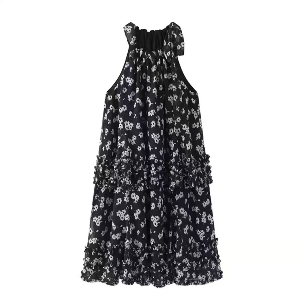 Este vestido negro con flores y detalles de volantes es perfecto para un look fresco y femenino, ideal para el verano y ocasiones casuales.
