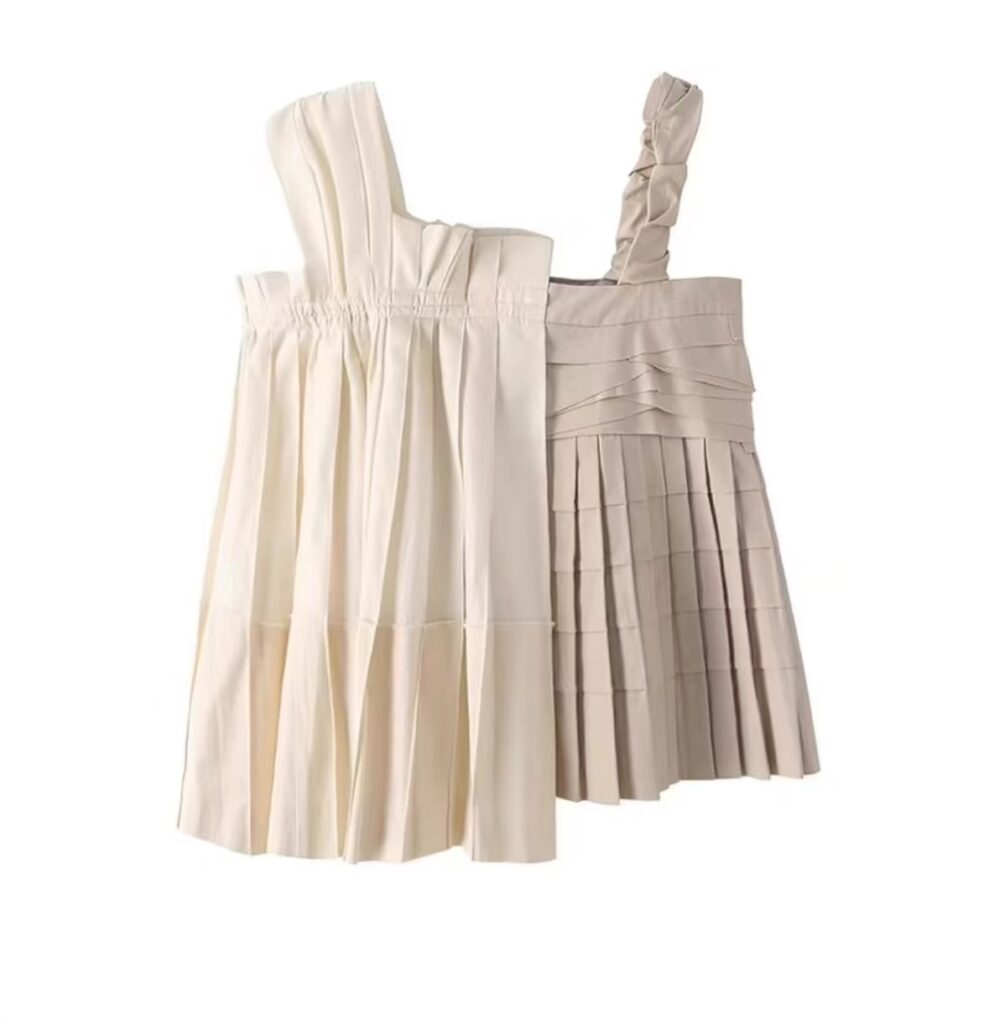 中性色调的不对称衬衫,独特的褶皱和吊带,完美的现代和优雅的外观。