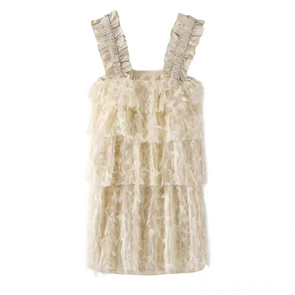 米色衬衫搭配分层蕾丝和褶皱吊带,在特殊场合看起来浪漫而复杂。