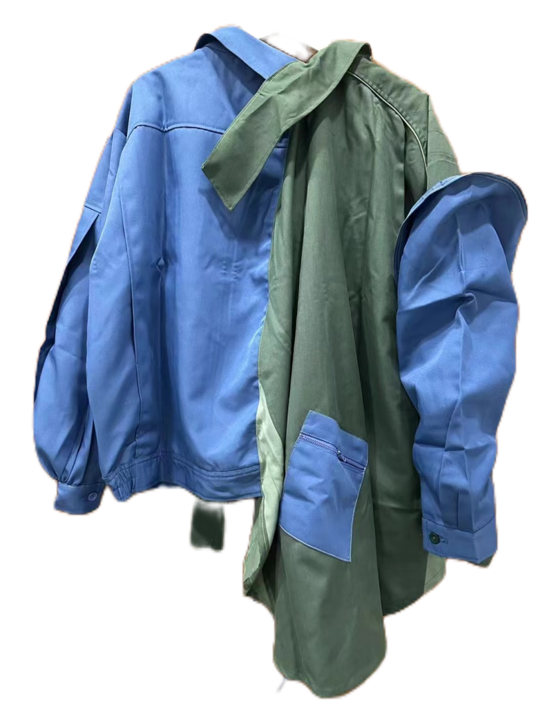 不对称的蓝色和绿色夹克,有实用的口袋,是现代和大胆外观的理想选择。