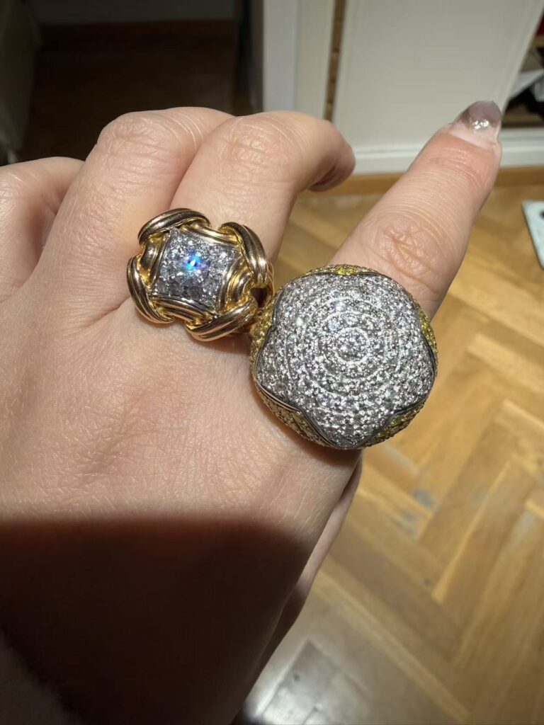 由黄金与钻石打造的雕塑感戒指组合,晶体质感的钻石内芯,如艺术品般点亮你的双手。