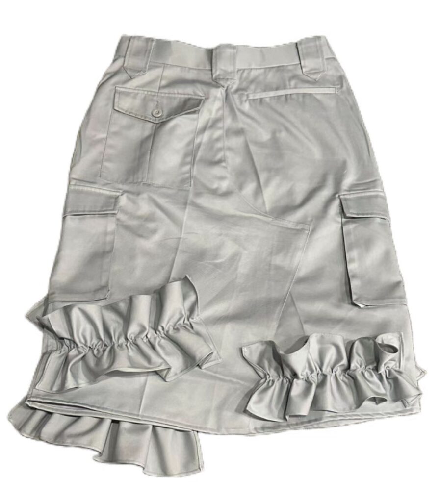 灰色缎面裙子,功能口袋和优雅的下摆装饰褶边,是现代和多功能风格的理想选择。