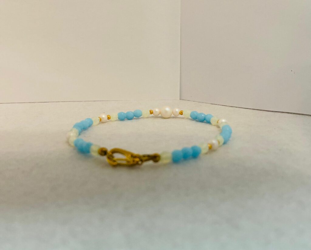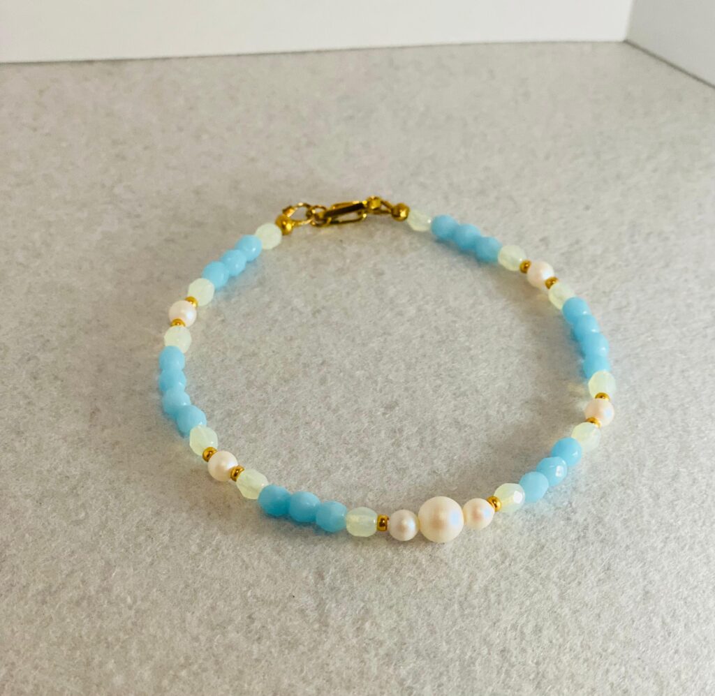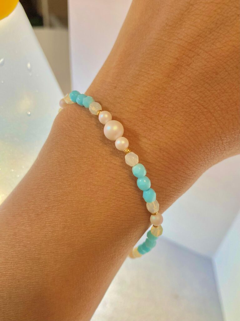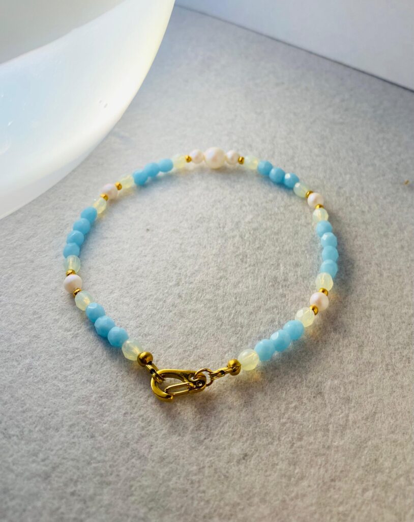 手工手镯与水晶× Miyuki珠子在天蓝色和珍珠白色的色调。与316L和304L不锈钢配件相结合,坚固,颜色明亮,不褪色。一个新鲜,精致和优雅的一块。.