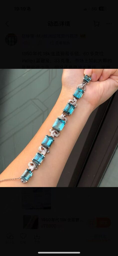 Pulsera vintage en oro 18K decorada con intensas turmalinas azul índigo en talla esmeralda. Una pieza sofisticada, elegante y con un brillo que enamora a primera vista.